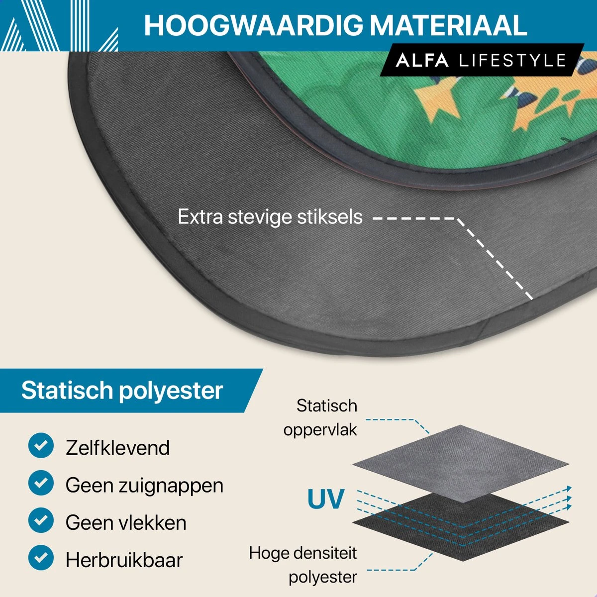 Onze zonnewering bestaat uit 80 gsm mesh voor optimale zonnebescherming. Deze hoogwaardige stof verlaagt de temperatuur en blokkeert direct zonlicht achterin voor een veilige rit met het hele gezin.