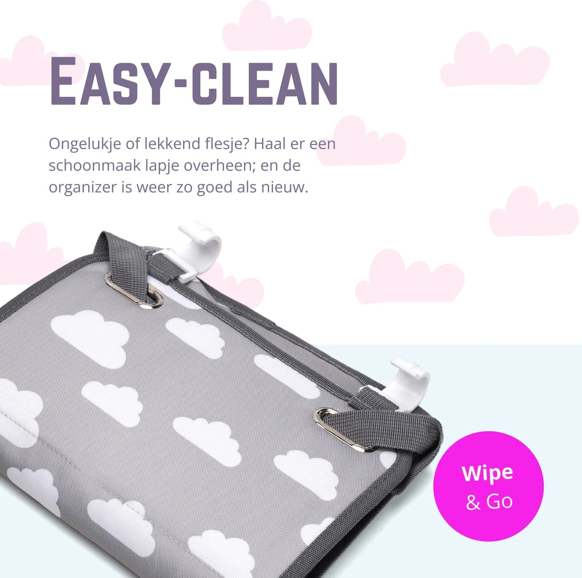 - Easy-clean – Ongelukje of lekkend flesje? Haal er een schoonmaak lapje overheen; en de organizer is weer zo goed als nieuw.