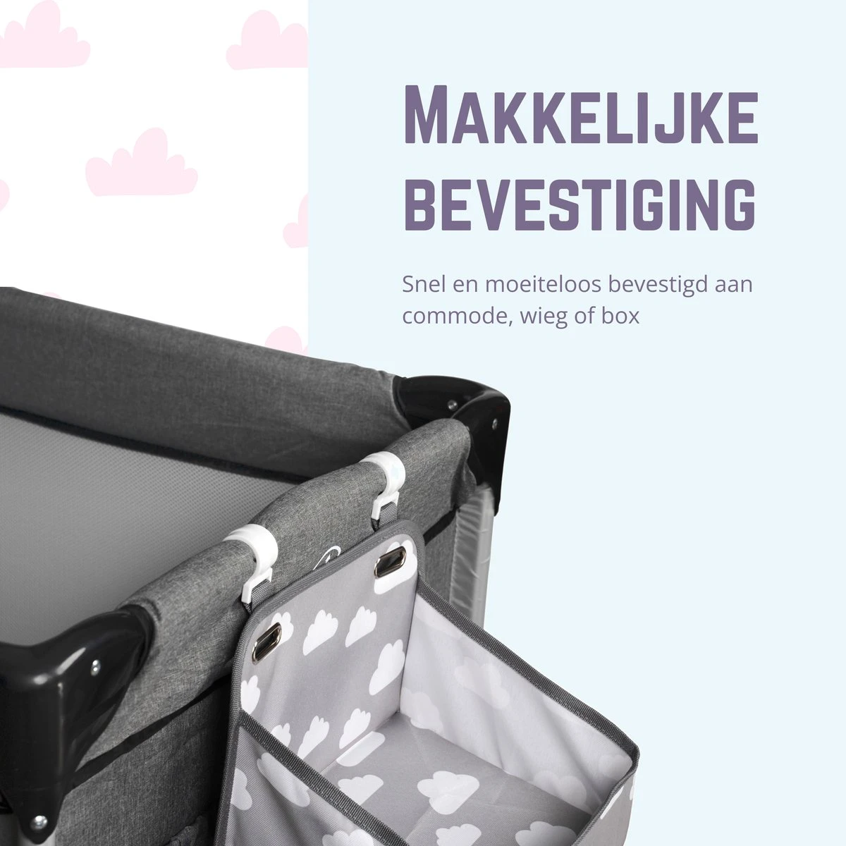 - Makkelijke bevestiging – Snel en moeiteloos bevestigd aan commode, wieg of box. Ophangen, afstellen en verschonen maar!