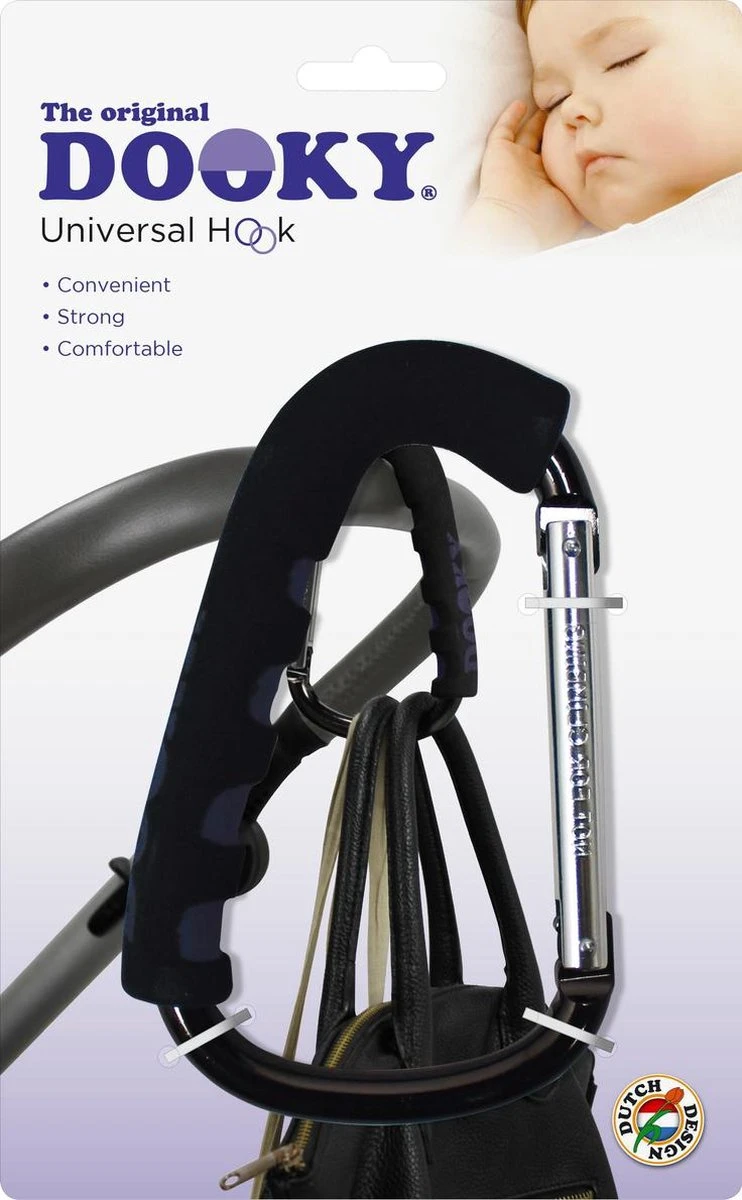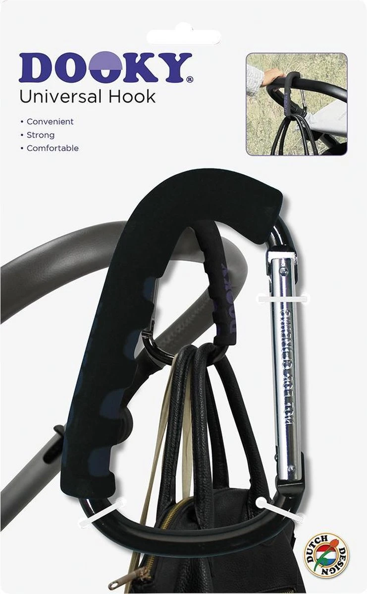 De Dooky Universele Haak is een โmust haveโ voor iedere ouder. Altijd een plek om je (extra) tas aan te hangen. Klik de robuuste Dooky haak aan de stang van je kinderwagen en hang er alle tassen aan. Snijdende plastic tasjes in je hand is daardoor verleden tijd. De sterke metalen tassenhaak houdt meerdere tassen bij elkaar. De schuimrubberen antislip laag zorgt ervoor dat de haak niet weg glijdt en mooi op zโn plek blijft. En ligt het zachte schuimrubber fijn in de hand.