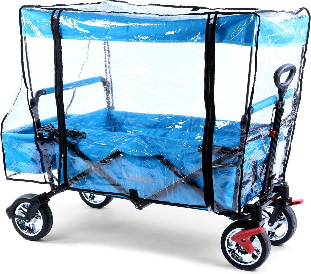 De regenhoes is in een mum van tijd uit te pakken en gemakkelijk over de wagen te plaatsen en dus ook bij lichte regen te gebruiken. De transparantie garandeert dat de gebruikers nog steeds niet zullen missen wat er om hen heen gebeurt. Aan de zijkanten is de bescherming te sluiten met klittenband.