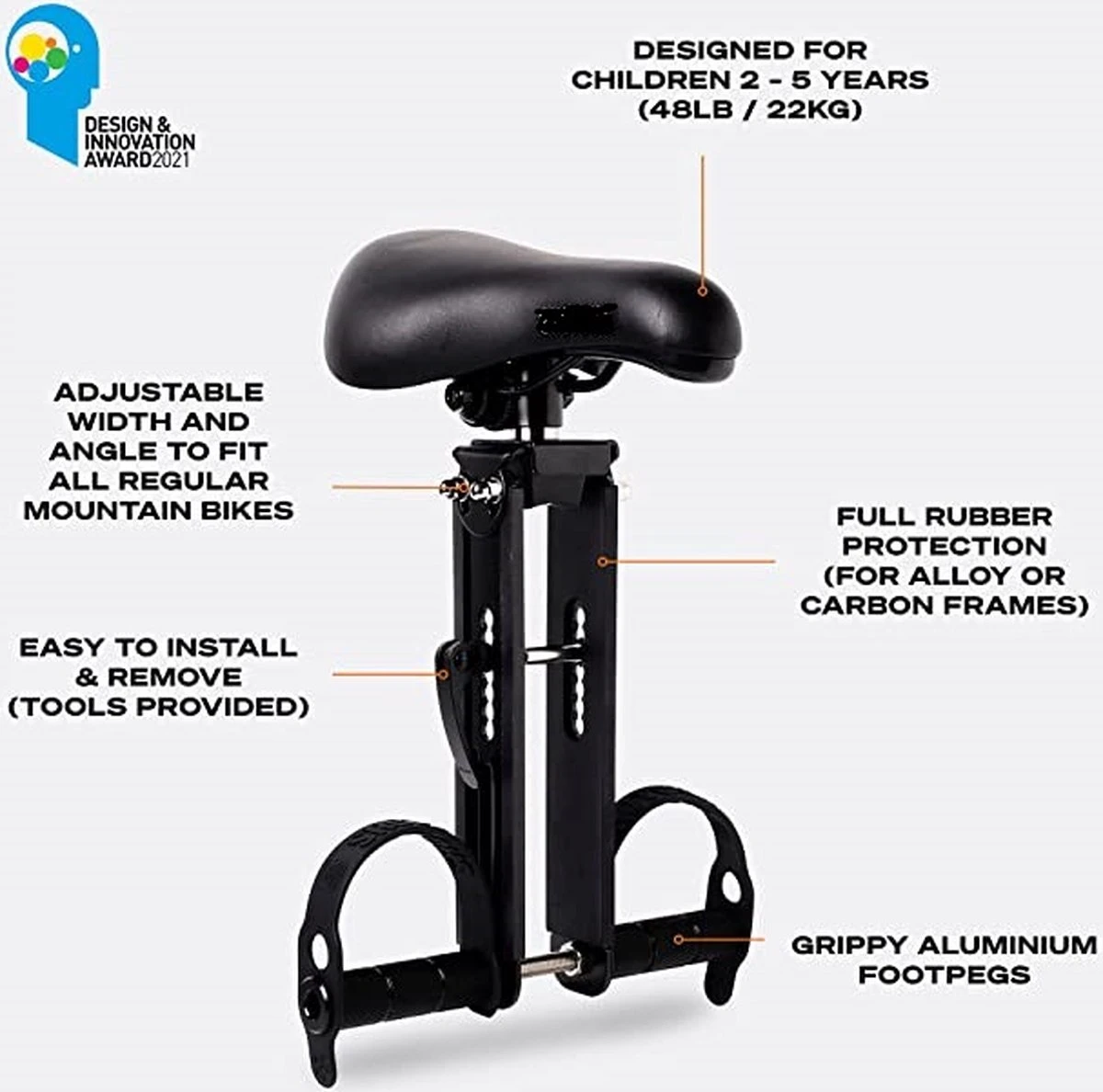 Het zitje is gemaakt van duurzaam materiaal en is verstelbaar voor een perfecte pasvorm. De zitting is bekleed met zacht foam voor extra comfort tijdens de rit. De zwarte kleur zorgt ervoor dat het zitje bij elke mountainbike past.