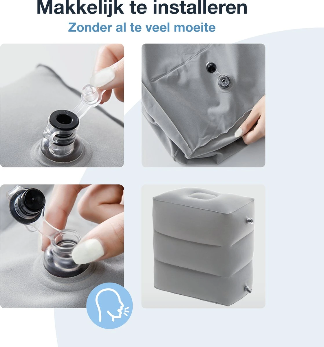 Deze voetensteun is voorzien van 2 dubbele ventielen voor eenvoudig opblazen en leeg laten. Open het ventiel volledig om het kussen snel op te kunnen blazen of leeg te laten lopen. Open het bovenste deel van het ventiel om lucht bij te blazen. Het terugloop stukje sluit het ventiel af waardoor er alleen lucht in kan en niet uit.