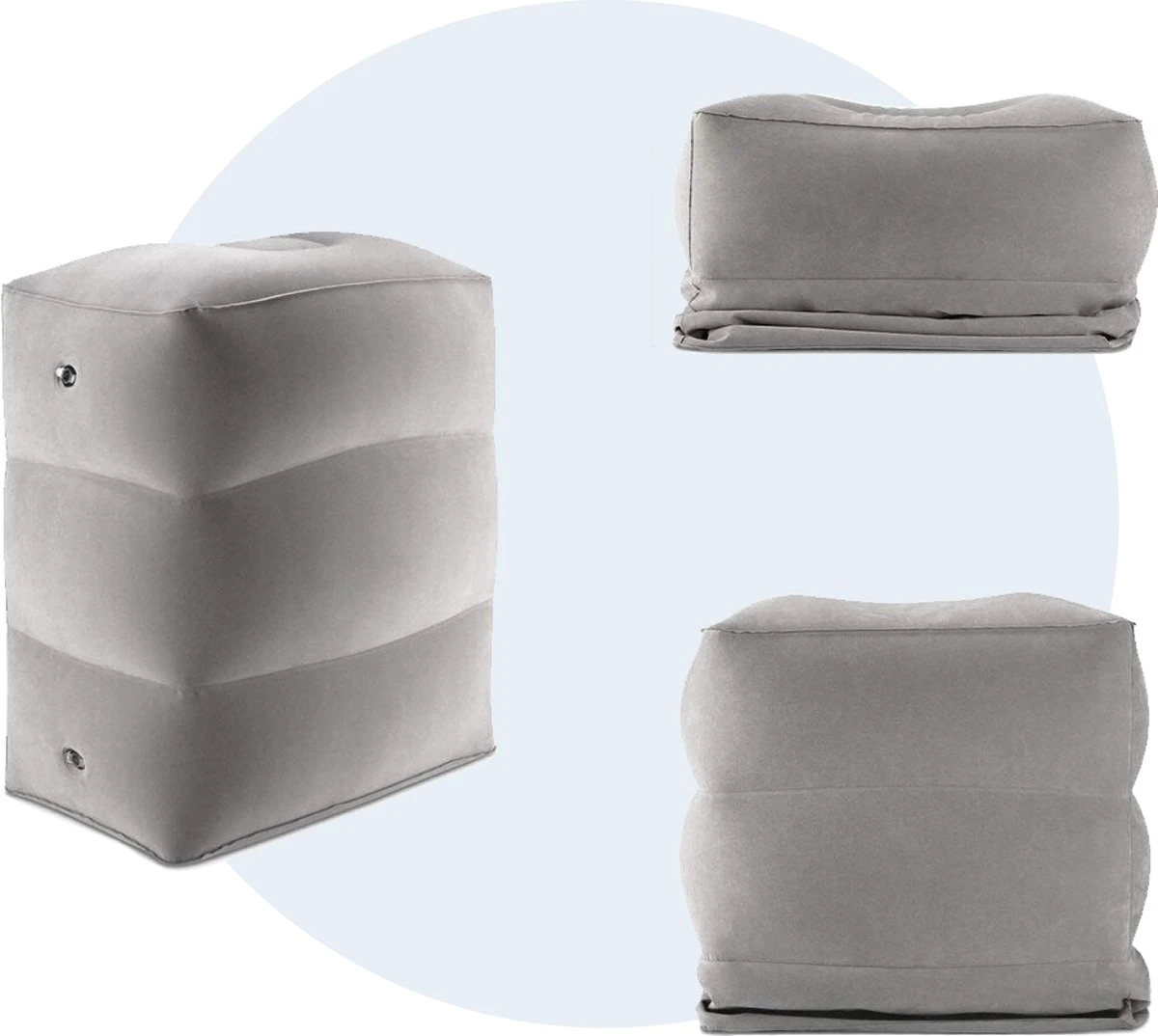 Dit opblaasbare kussen is onmisbaar als je op reis gaat met kleine kinderen. Doordat de kinderen in het voertuig kunnen slapen zullen zij minder vermoeid zijn. Maar ook voor jezelf biedt het in veel situaties extra comfort. Gebruik het als een voetensteun tijdens een lange zakenreis in de auto, trein of als vliegtuigkussen. Ook thuis of op kantoor biedt het voetkussen een aangename houding voor de benen en voeten door een betere doorbloeding.