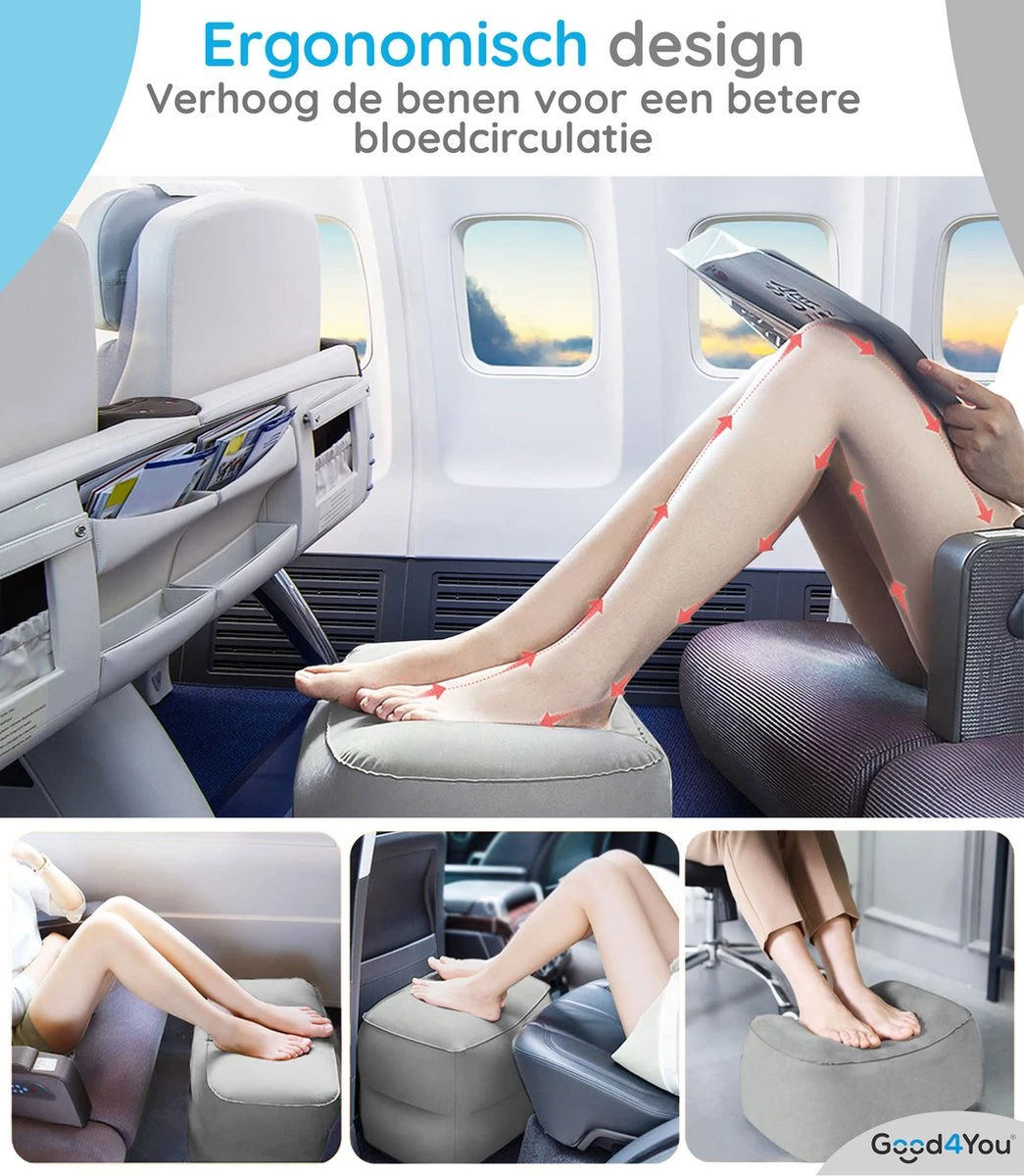 Dit opblaasbare kussen is onmisbaar als je op reis gaat met kleine kinderen. Doordat de kinderen in het voertuig kunnen slapen zullen zij minder vermoeid zijn. Maar ook voor jezelf biedt het in veel situaties extra comfort. Gebruik het als een voetensteun tijdens een lange zakenreis in de auto, trein of als vliegtuigkussen. Ook thuis of op kantoor biedt het voetkussen een aangename verlichting voor de benen en voeten.