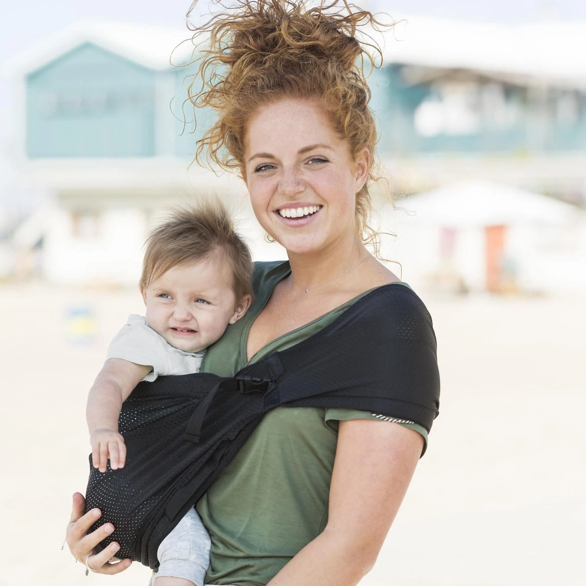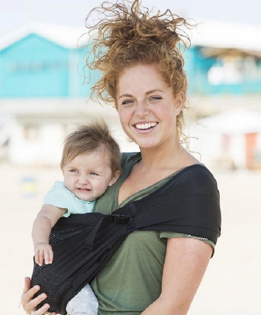 Deze handige babydrager is gemaakt van een ‘mesh’ stof. Dit is een stof met allemaal kleine gaatjes waardoor hij lekker licht en luchtig is. Dit maakt dat je hem ook heel goed kunt gebruiken bij wat warmer weer. Daarnaast is hij waterproof, dus ideaal voor onder de douche, in het zwembad of voor op het strand.