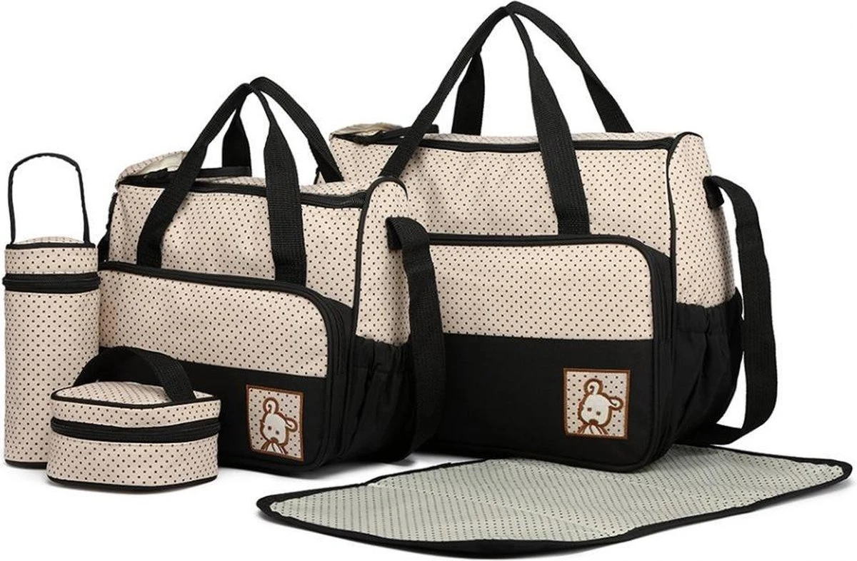 Deze complete Miss Lulu luiertas set is ideaal voor onderweg. Een compacte en functionele set met een 2 verschillende formaten luiertassen inclusief verschoonmatje voor je baby en een tasje voor de fles en het eten. Deze complete, betaalbare luiertas set mag niet ontbreken in je baby uitzet! Met 5 verschillende tassen is de verzorgingstas gemakkelijk te organiseren, super handig in gebruik en biedt werkelijk een zee van ruimte. Denk aan luiers, flesjes, babyvoeding, speentjes, slabbetjes en rompertjes, voor werkelijk alles is een plekje. De 5-delige set is gemaakt van hoogwaardig waterafstotend polyester, heeft een stijlvol design en gaat de gehele luiertijd mee! Of je nou boodschappen gaat doen, op een speelafspraakje gaat of een dagje weg; deze veelzijdige tas komt altijd van pas!