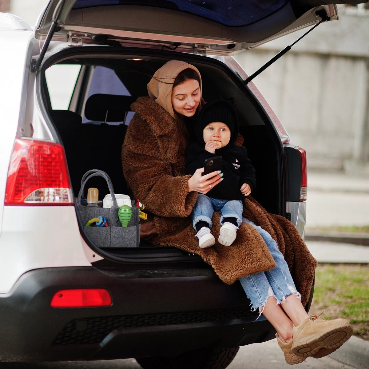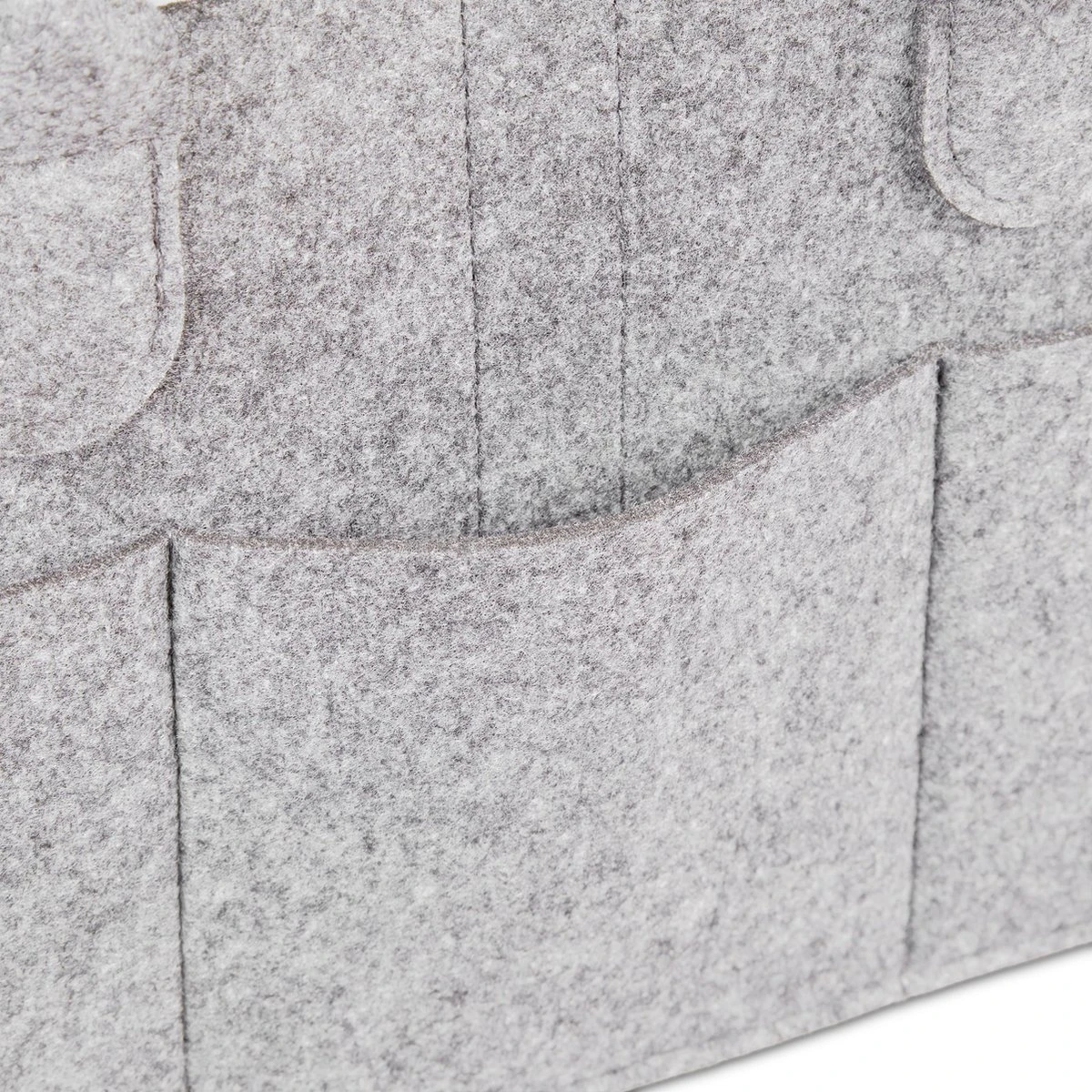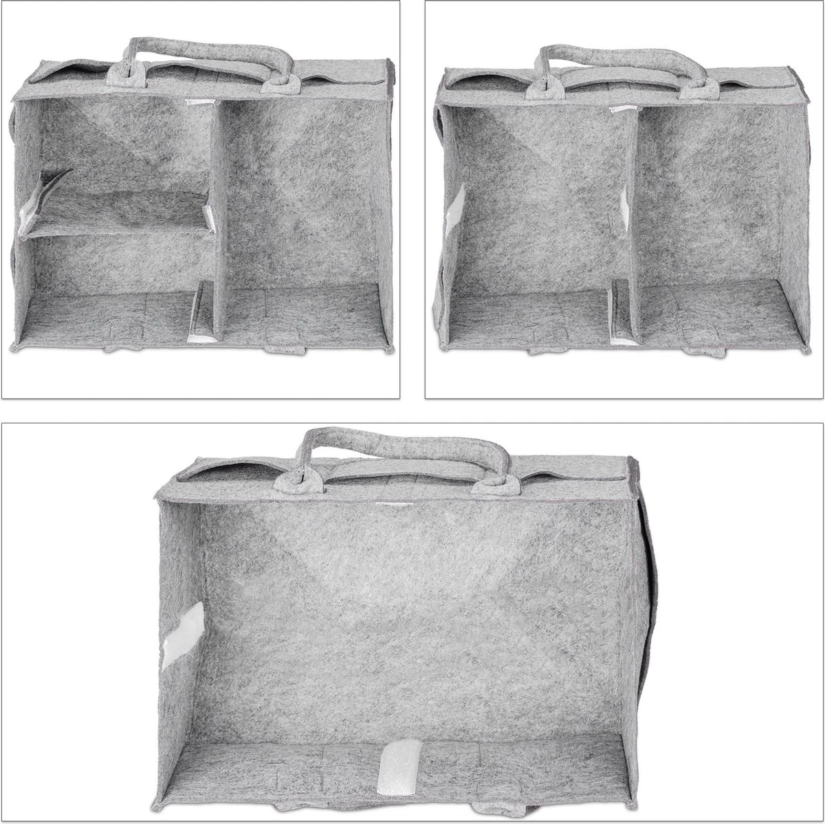 Verschillende baby accessoires kunnen in de vilten luiertas overzichtelijk en grijpbaar opgeborgen worden. 11 vakken bieden genoeg ruimte voor luiers, doekjes, flessen en crรจmes voor babyโs. De grootte van de binnenkant van de verzorgingstas kan je dankzij de uitneembare schotjes naar wens aanpassen. De luiertas kan goed gedragen worden dankzij de 2 hengsels. Hierdoor is hij ook perfect als kofferbak organizer in de auto of als mooie vilttas voor in de woonkamer.